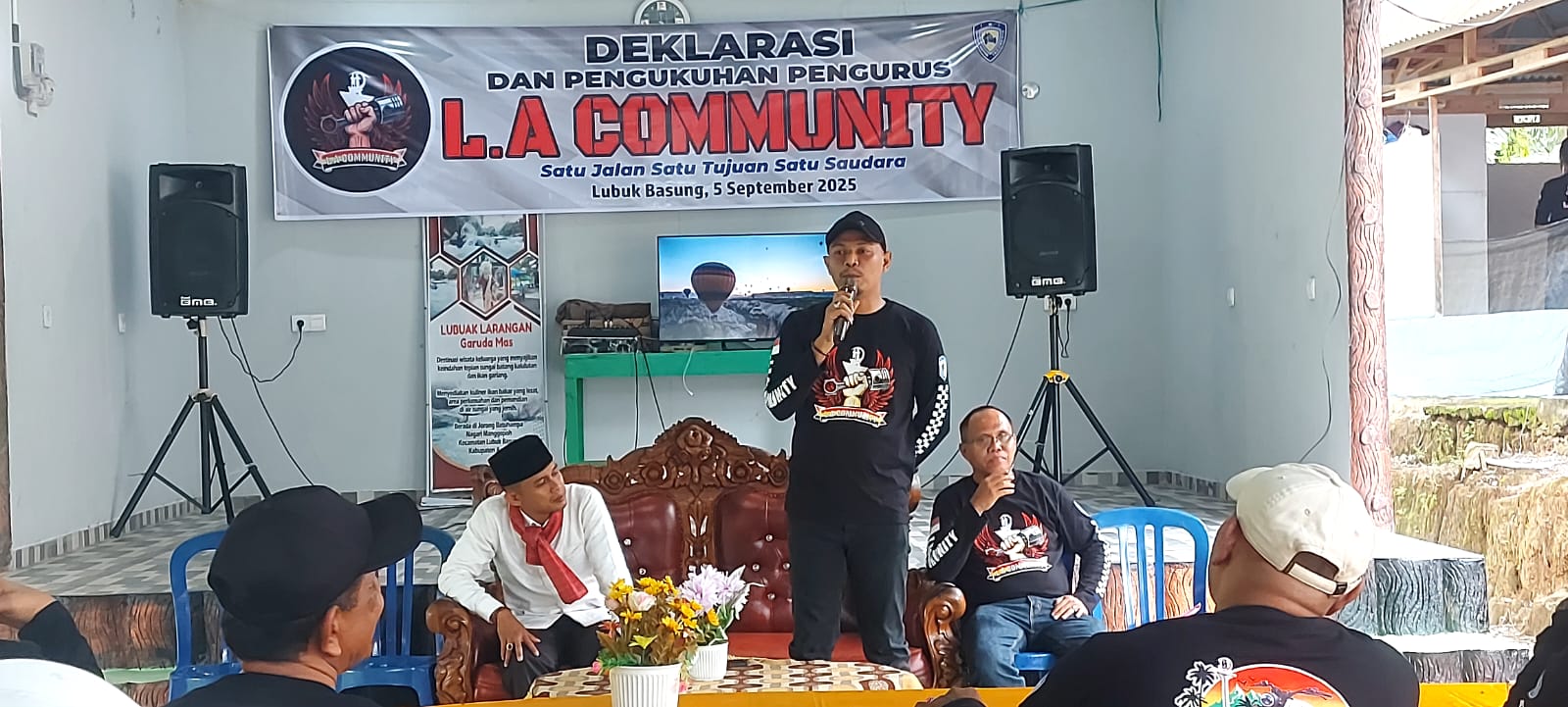 DetakDetik.com | Camat Lubuk Basung Ricky Eka Putra secara resmi mengukuhkan kepengurusan perdana komunitas pecinta touring sepeda motor L.A Community di Objek Wisata Garuda Mas, Batu Hampar, Manggopoh, Jumat (5/9/2025).