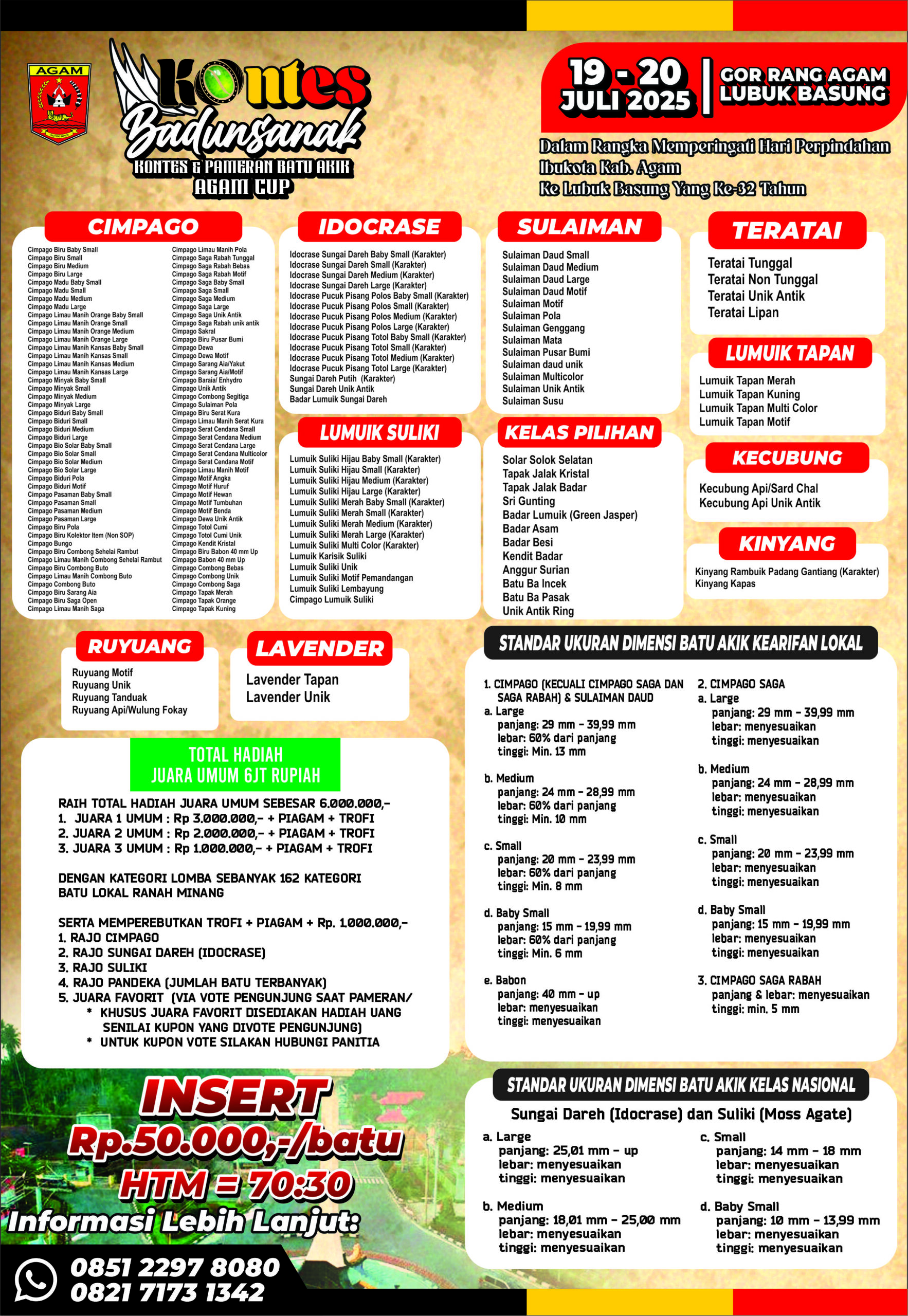 Detakdetik.com – Dunia perbatuan akik di Kabupaten Agam kembali menggeliat. Kontes dan Pameran Akik “Agam Cup” bakal digelar selama dua hari, yakni pada 19-20 Juli 2025.